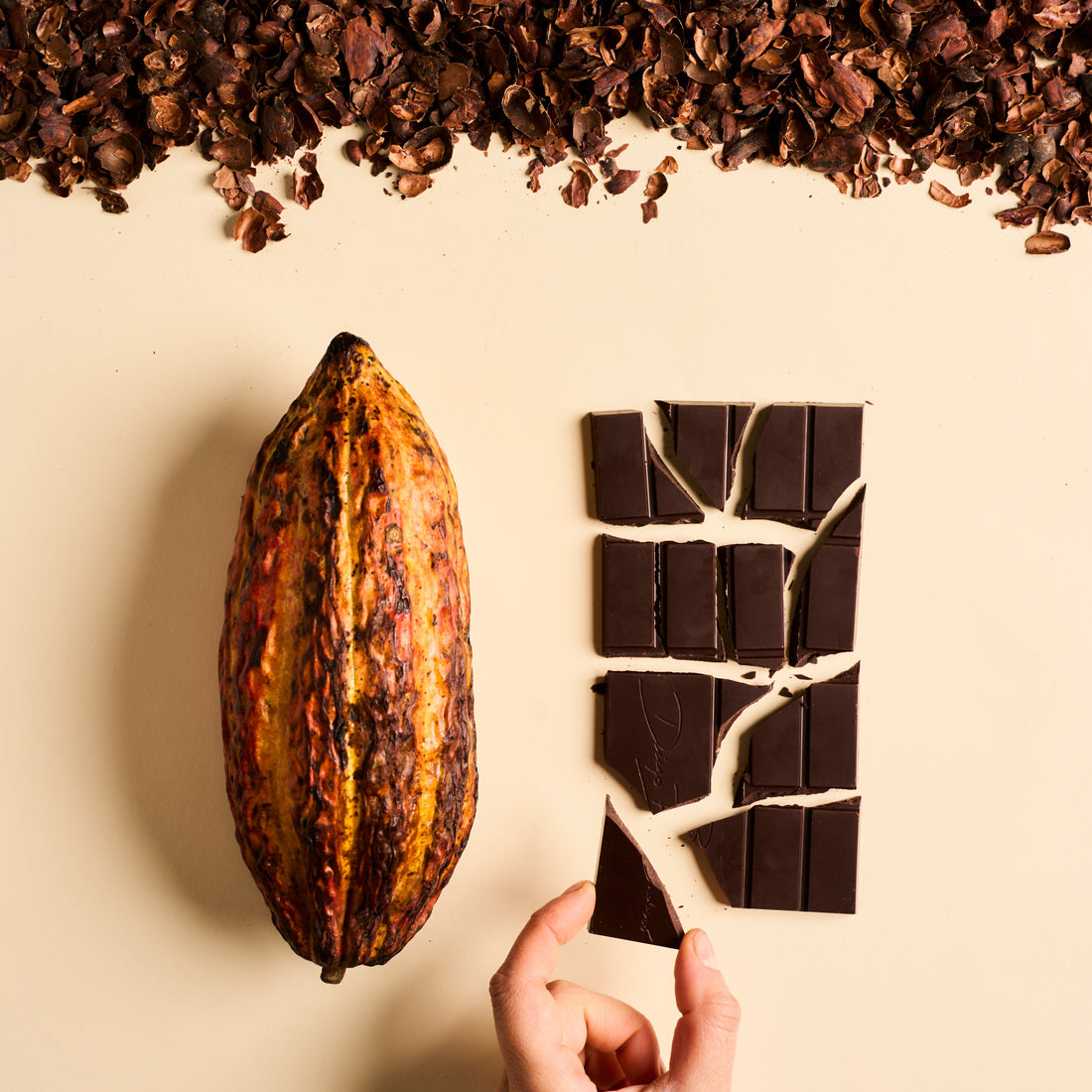 Nossa linha 100% cacau é feita apenas com massa de cacau orgânica, sem adição de açúcar ou qualquer outro ingrediente.