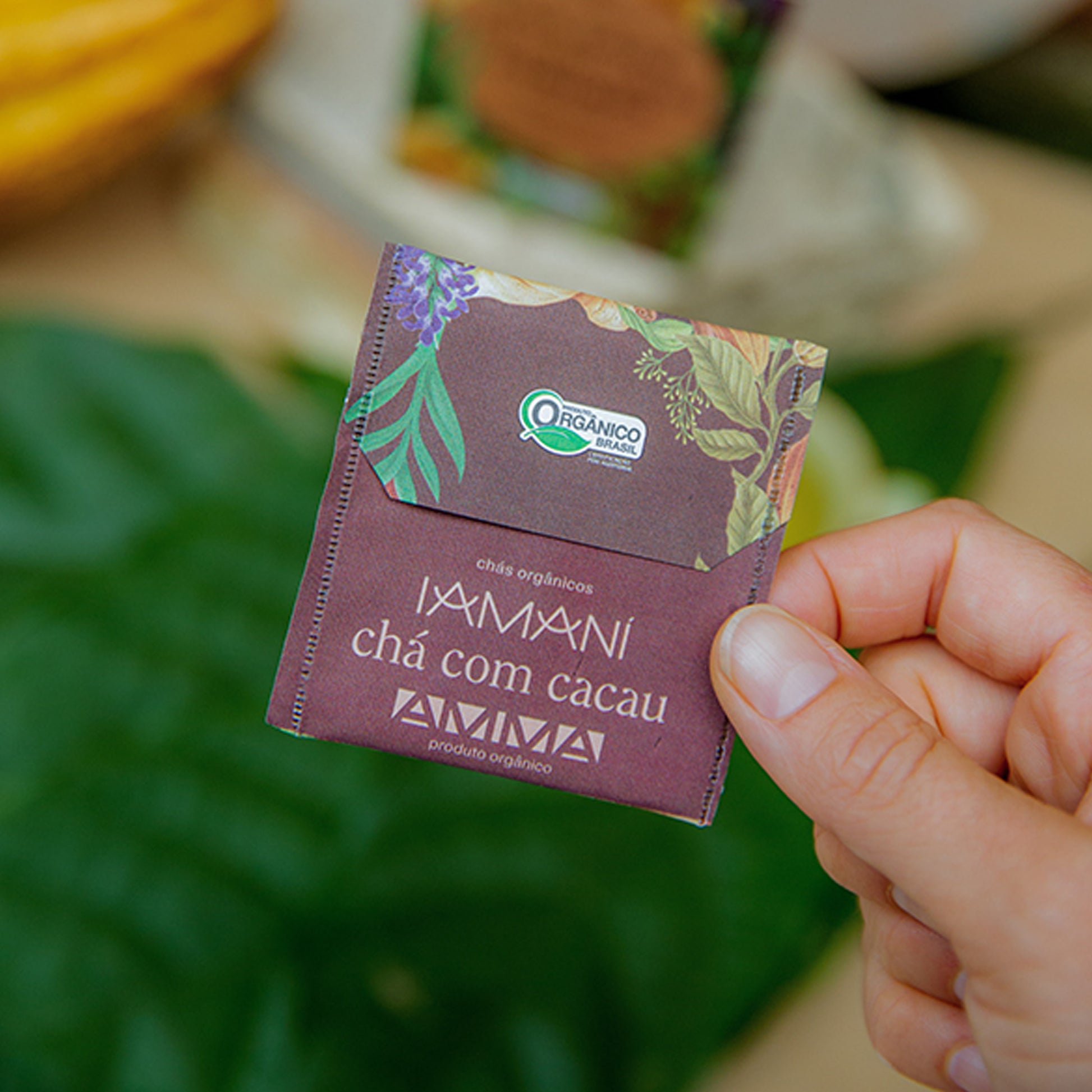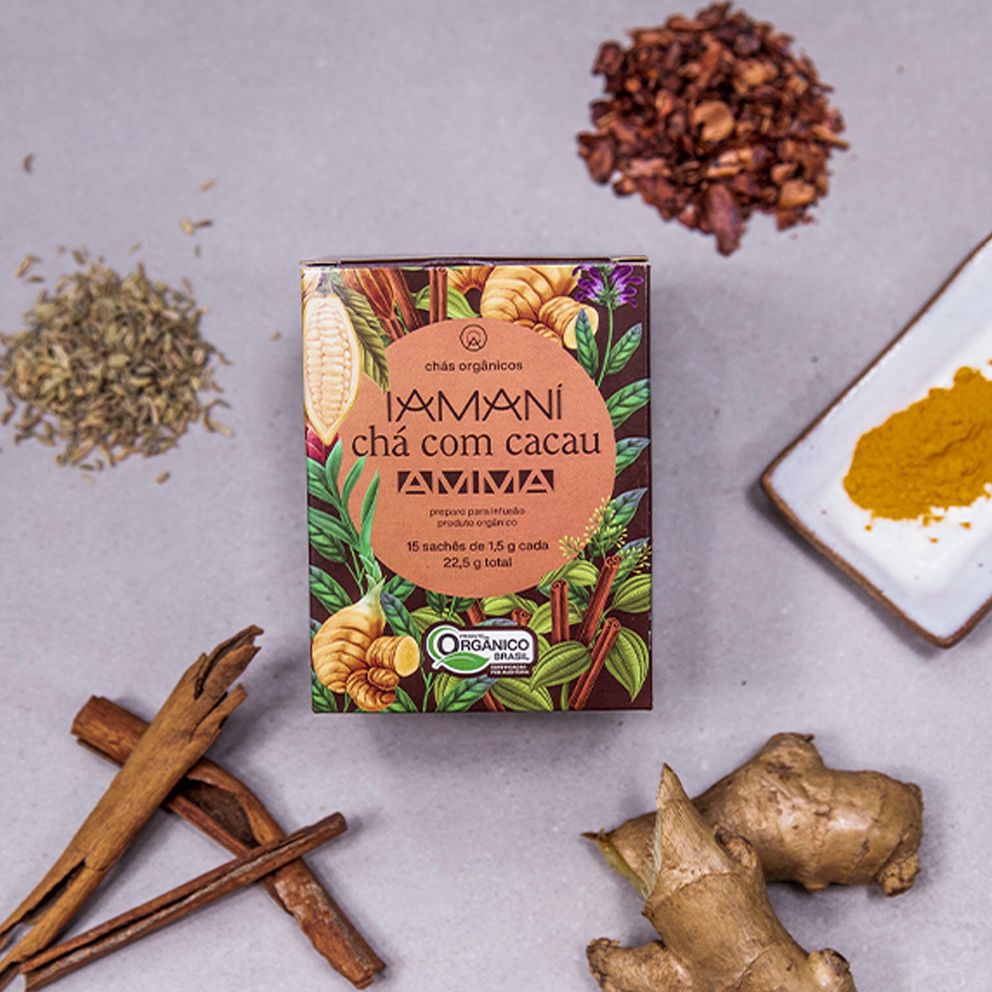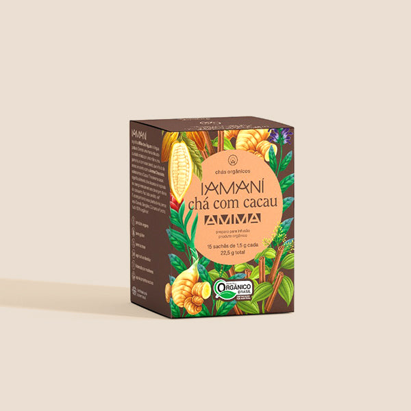 Uma parceria entre Iamaní - Chás Orgânicos e AMMA Chocolate, que traz um blend com diversas especiarias, como: canela, gengibre, cúrcuma, funcho e claro, nosso cacau puro da floresta.