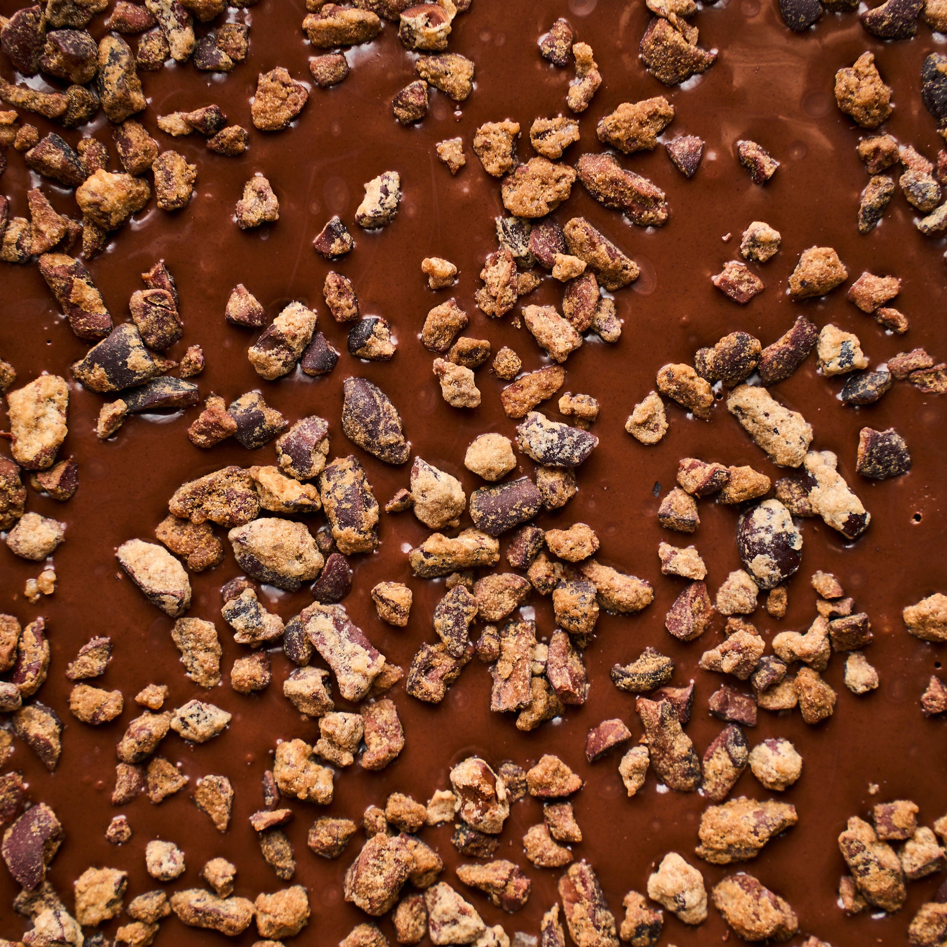 Nesta criação, o nosso chocolate 60% orgânico encontra a textura vibrante dos nibs de cacau caramelizado. Um contraste pensado para despertar os sentidos: primeiro, o crocante delicado dos nibs; depois, a doçura leve do caramelo; por fim, o derreter lento e elegante do chocolate, revelando suas notas envolventes.