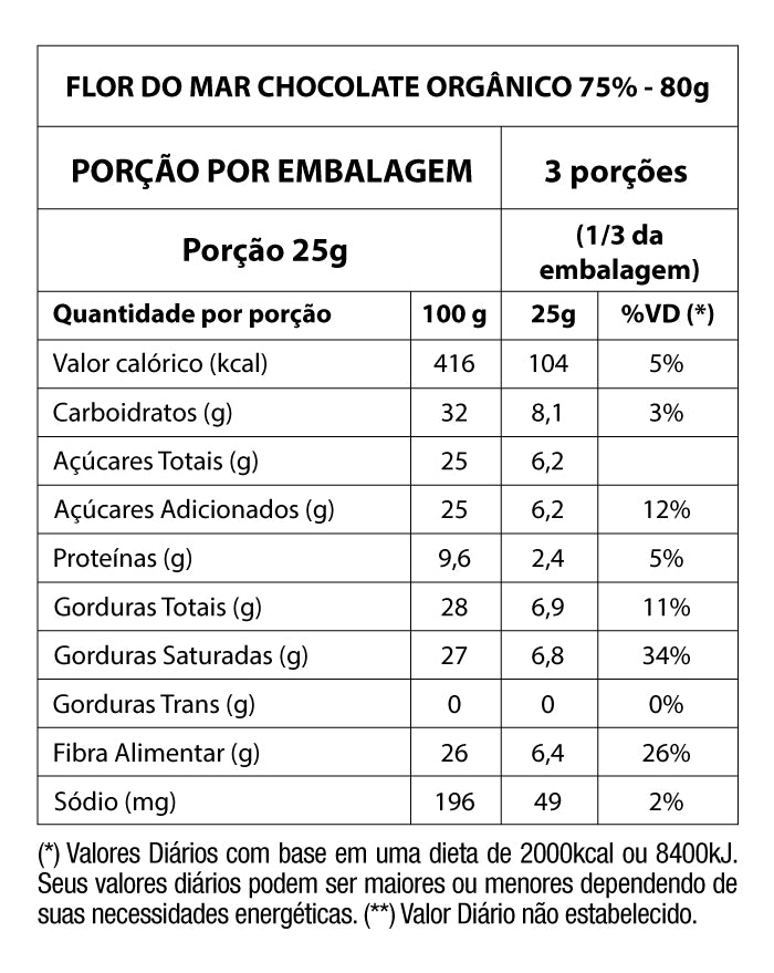 Chocolate Orgânico Flor do Mar 75% Cacau com Flor de Sal 80g