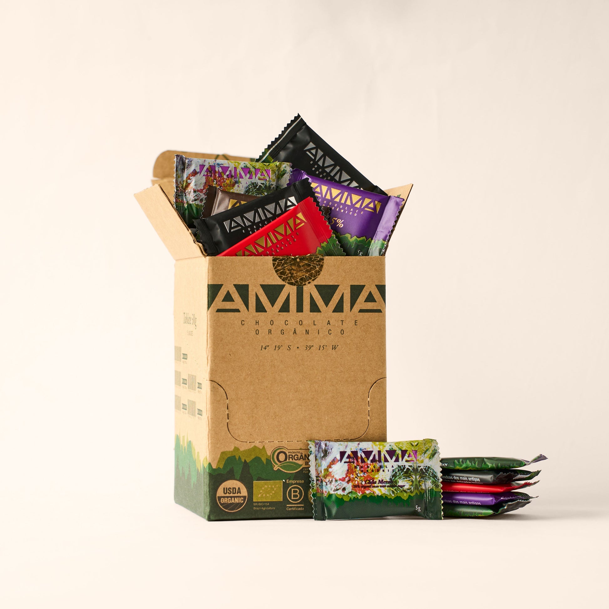 Uma caixa sortida com 50 chocolates orgânicos de 5g (60% a 100% cacau), perfeita para ter sempre por perto: no café da manhã, no escritório ou para aquele momento só seu. Praticidade e intensidade para saborear a floresta a qualquer momento.